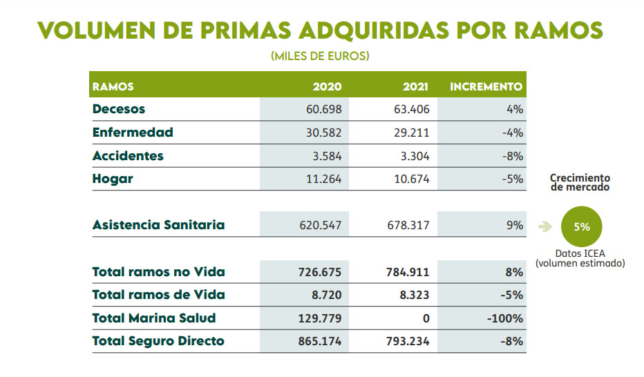 En 2021 la aseguradora cosechó un volumen de primas de 793 millones, lo que supone un crecimiento del 8%, excluida la actividad de Marina Salud. Por líneas de negocio, el grueso del negocio que es Asistencia Sanitaria aumentó un 9% hasta los 678 millones. La segunda parte más importante, el ramo de Decesos alcanzó 63,4 millones en primas, con un aumento del 4%. Los seguros de Incapacidad (Enfermedad) registraron 29 millones y un retroceso del 4%.