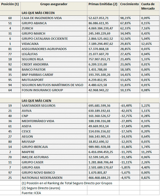 El quinteto ganador en crecimiento de facturación por primas lo conformaron: Caja de Ingenieros Vida, un 98,23% (puesto 60); Grupo Abanca, un 67,83% (puesto 51); Zurich, un 62,33% (puesto 4); Grupo March, un 34,94% (puesto 31) y Catalana Occidente, un 32,56% (puesto 6).