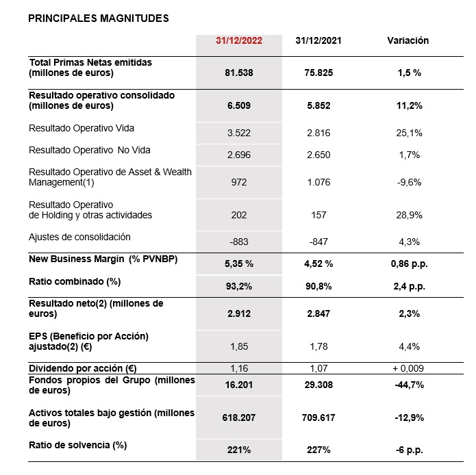 Además, su volumen de primas netas emitidas se ha elevado un 1,5%, ascendiendo a 81.538 millones de euros, con un fuerte crecimiento en No Vida (+9,8% y 28.636 millones). Mientras, en Vida, la facturación ha caído un 2,4%, hasta aportar 52.902 millones. El ratio combinado fue del 93,2%, 2,4 puntos más que en 2021, y su margen de solvencia ha empeorado 6 puntos, situándose en el 221%.