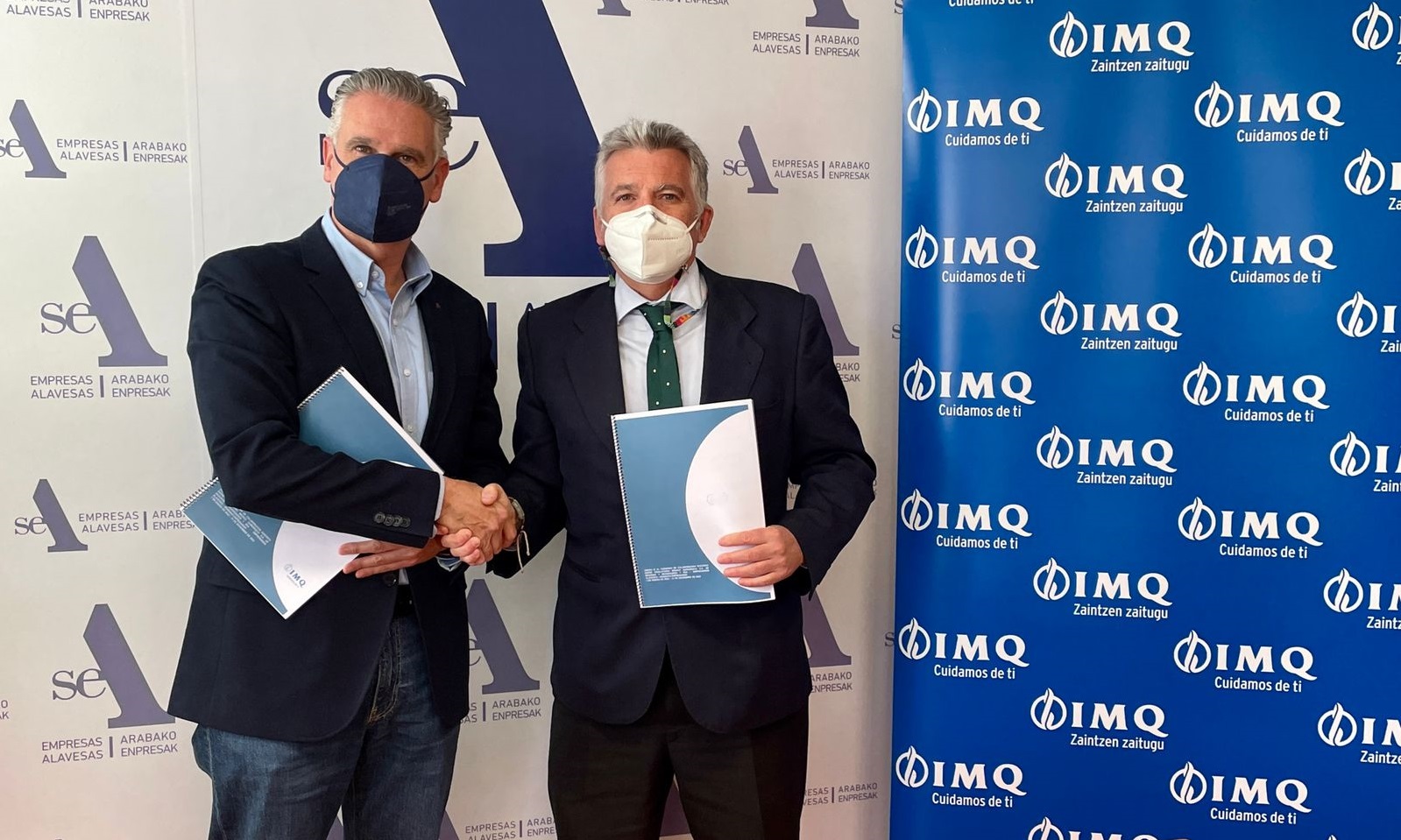 El director general de SEA Empresas Alavesas, Juan Ugarte, y el director de desarrollo de negocio y canales de venta de IMQ, Luis Fernández de Larrea, han suscrito un nuevo acuerdo que posibilitará que los empleados de las empresas adscritas a esta organización empresarial contraten en condiciones ventajosas, para ellos y sus familias el seguro de Salud de IMQ.