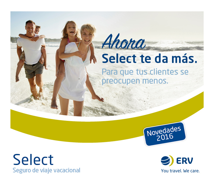 ERV Seguros de Viaje ha incorporado a su producto Select 2016 para vacaciones nuevas coberturas y límites. Destaca las garantías de asistencia, accidentes o secuestro del medio de transporte, y aumenta los límites de coberturas como demora de equipaje, pérdida de enlaces del medio de transporte, o denegación de embarque por overbooking, “todo con precios más competitivos”.