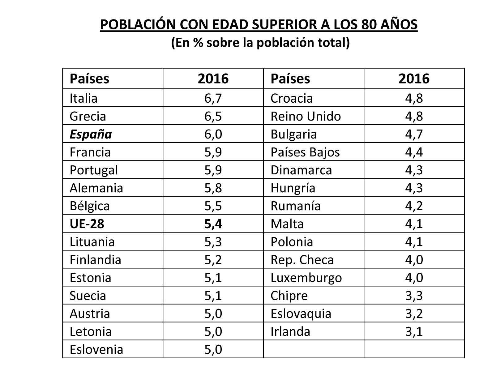 Italia ocupó el primer lugar con un 6,7% de población mayor de 80 años, mientras en Grecia era del 6,5%. En España las personas mayores de 80 años suponían un 6%. En cambio, los menores porcentajes se registraron en Chipre (3,3%), Eslovaquia (3,2%) e Irlanda (3,1%).