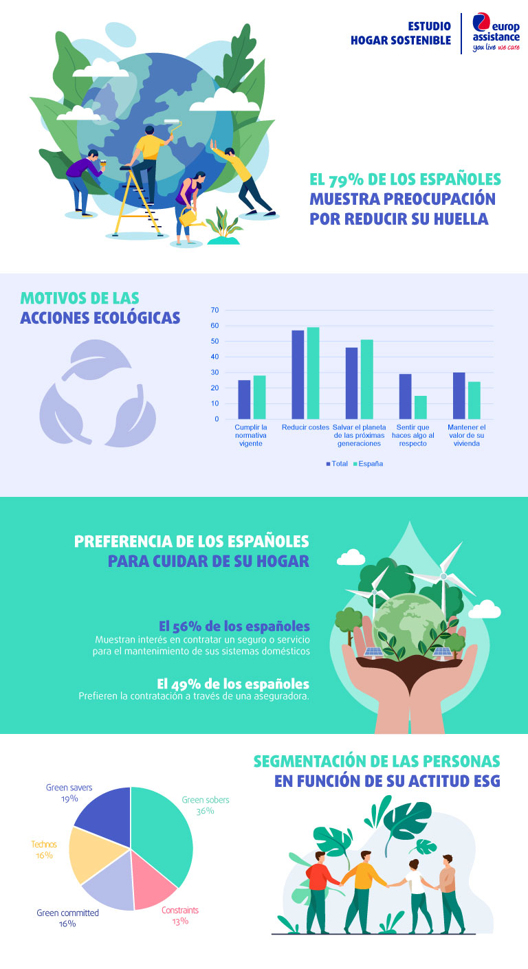 El 79% de los españoles muestra preocupación constante por reducir su huella en general y, de manera notable, el 75% manifiesta esta preocupación específicamente en el ámbito doméstico, siendo un indicativo claro del compromiso de la sociedad española con prácticas más respetuosas con el medio ambiente. Estos datos proceden de la encuesta 'Hogar Sostenible', la primera que realiza Europ Assistance sobre esta materia y que tiene como objetivo identificar las percepciones y los comportamientos relacionados con ESG (ambientales, sociales y de gobierno corporativo) en el hogar y evaluar el atractivo de diversos servicios.