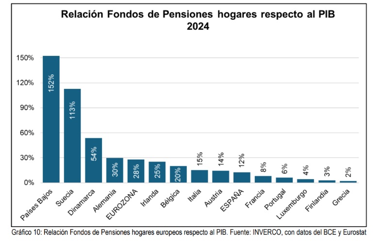 Uno de los datos más significativos del informe es la desigual implantación de los Fondos de Pensiones en Europa. Mientras en Países Bajos el volumen de estos activos en manos de los hogares supera el 150% del PIB, y en Suecia alcanza el 113%, en España apenas roza el 12%. Aunque el crecimiento desde 2012 ha sido positivo (1,7 veces más), sigue siendo inferior al registrado en otras economías: Suecia ha triplicado su volumen en este periodo, y Alemania lo ha multiplicado por 1,9.
