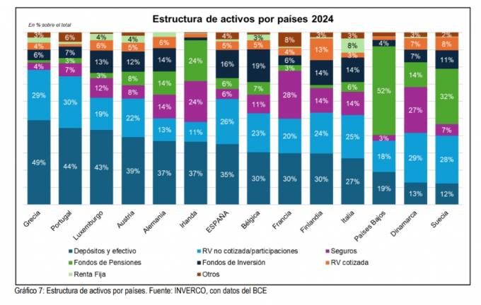 Por otro lado, los depósitos y el efectivo siguen siendo el principal vehículo de ahorro en Europa, acumulando 10,7 billones de euros. En el caso español, estos activos representan el 35% del total del ahorro financiero de los hogares, ligeramente por encima de la media europea (32%), aunque en mínimos desde 2017. En países como Grecia o Portugal, esta proporción es todavía mayor, con un 49% y 44%, respectivamente.
