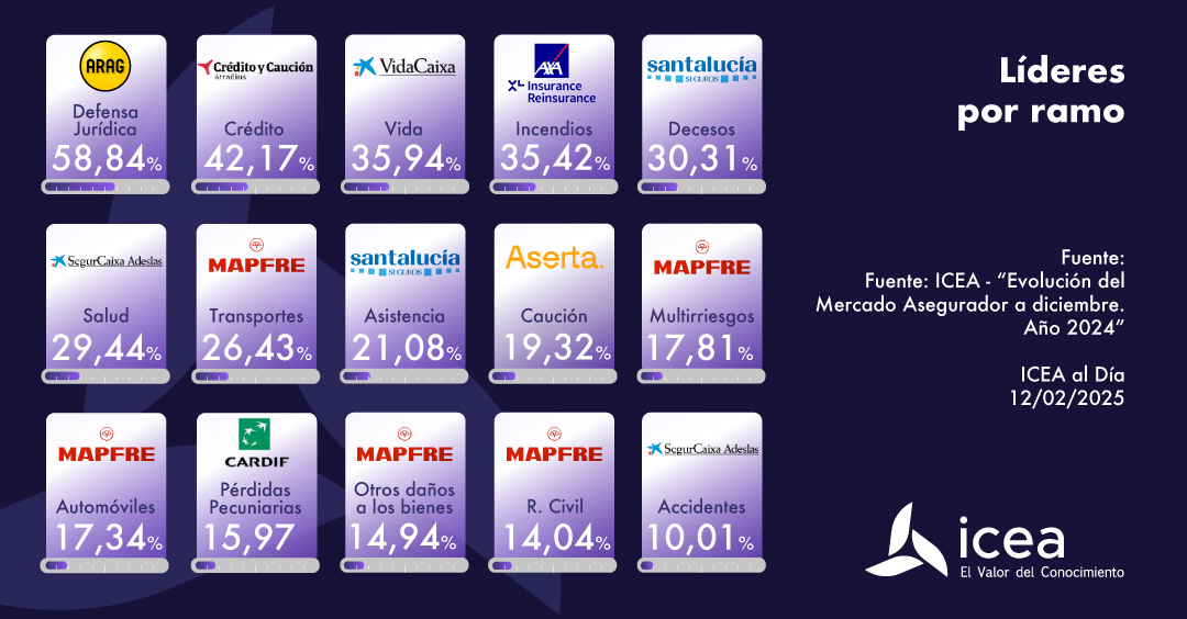 ICEA ha publicado los rankings definitivos del ejercicio 2024 con las aseguradoras líderes en 15 ramos. Mapfre encabeza un total de 5: Transportes, con una cuota de mercado del 26,43%; Multirriesgos (17,81%); Autos (17,34%); Otros daños a los bienes (14,94%) y RC (14,04%). Santalucía domina 2 ramos: Decesos (30,31%) y Asistencia (21,08%). También es líder en 2 ramos SegurCaixa Adeslas: Salud (29,44%) y Accidentes (10,01%).