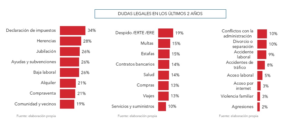 Onlygal acaba de publicar el estudio 'Necesidades y percepciones sobre las soluciones legales' en el que desgrana las 24 principales dudas de los españoles en cuestiones legales.