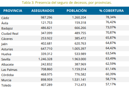 Lo primero que destaca es que más de 22 millones de españoles tenían cubierto su sepelio al cierre de 2022, lo que equivale al 47% de la población española. Y tiene una elevada presencia en todo el territorio nacional. Así, la provincia con un mayor volumen de asegurados en términos relativos es Cádiz, donde un 78% de los residentes está cubierto. A continuación, se sitúan Ávila (76%), Badajoz (73%), Ciudad Real (71%) y Cáceres (66%).