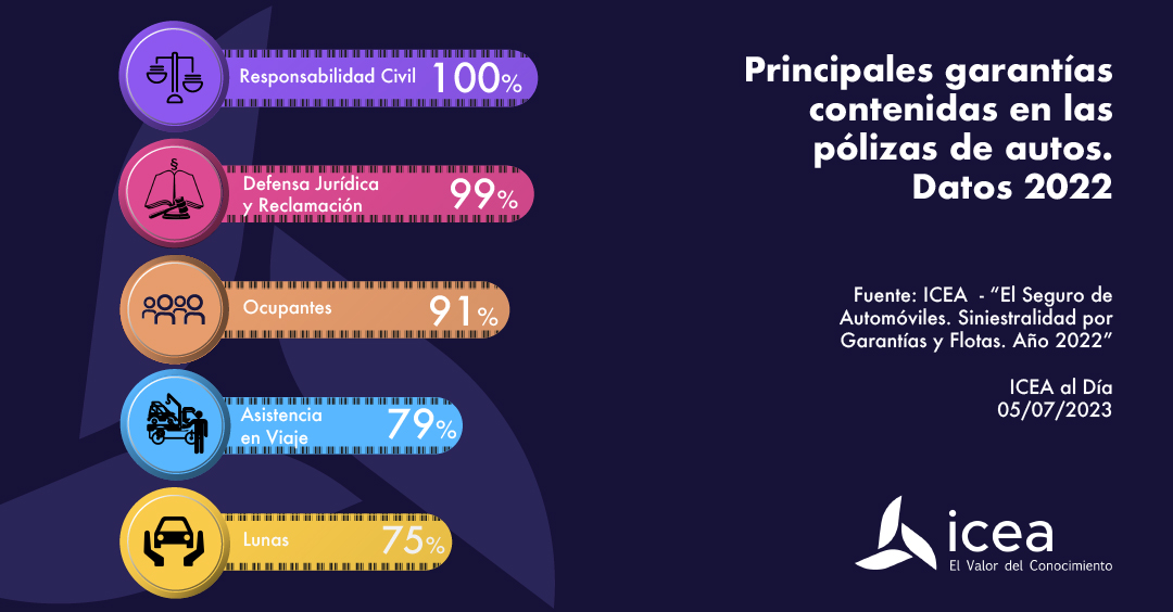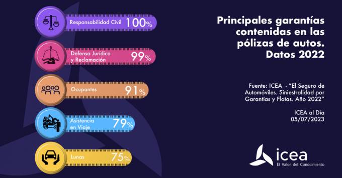 No hay dudas de cuál es la garantía más incorporada en los seguros de Autos. Es RC, que al ser la única obligatoria, está en el 100% de las pólizas comercializadas. A continuación, según datos facilitados por ICEA correspondientes al ejercicio 2022, se sitúa Defensa Jurídica, que está en el 99% de los seguros. Y el podio lo completa la garantía de Ocupantes, con una cuota del 91%.