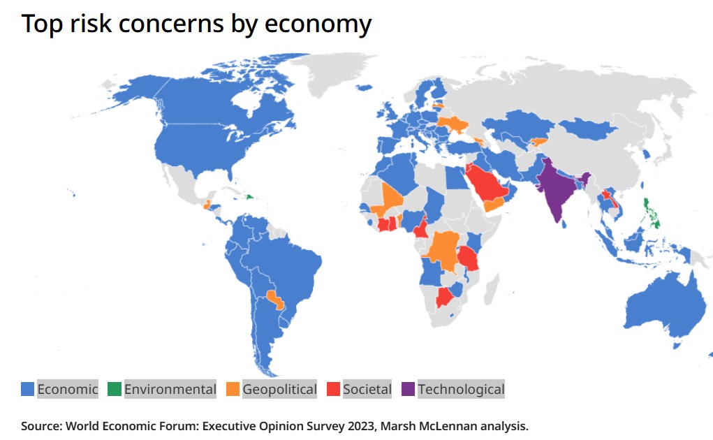 La mayoría de líderes de los países del G20 mantienen su preocupación por las amenazas inminentes de recesión, escasez de mano de obra y aumento de la inflación, como recoge la Executive Opinion Survey, realizada por el Foro Económico Mundial y publicada hoy por sus socios estratégicos Marsh McLennan y Zurich Insurance Group. La encuesta anual muestra que por detrás se sitúan la pobreza y la desigualdad, en cuarto lugar de esa lista de principales riesgos, y la quinta posición la ocupan los fenómenos meteorológicos extremos. Esto se produce tras un año en el que muchos países del G20 -incluidos Brasil, Alemania, Indonesia y Estados Unidos- experimentaron graves inundaciones, precipitaciones superiores a la media, incendios forestales, altas temperaturas o una elevada actividad de huracanes.