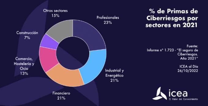 El informe de ICEA 'El seguro de Ciberriesgos. Año 2021' pone de manifiesto que los sectores profesionales, industrial-energético y financiero acapararon el 65% de las primas Cyber que se firmaron en España durante el pasado año. Además, representan el 43% de las pólizas.