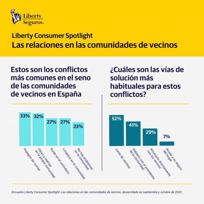 Liberty Seguros, Consumer Spotlight, ha publicado una encuesta sobre los conflictos en las comunidades de vecinos y sus posibles soluciones. Según revela el estudio el mayor conflicto surge por los impagos de las cuotas (33%) seguido muy de cerca por la dificultad para ponerse de acuerdo sobre las obras a realizar en la propia comunidad (32%). El ruido en el vecindario (27%) y la limpieza en la comunidad (27%) son los principales problemas de convivencia en las comunidades de vecinos en España.