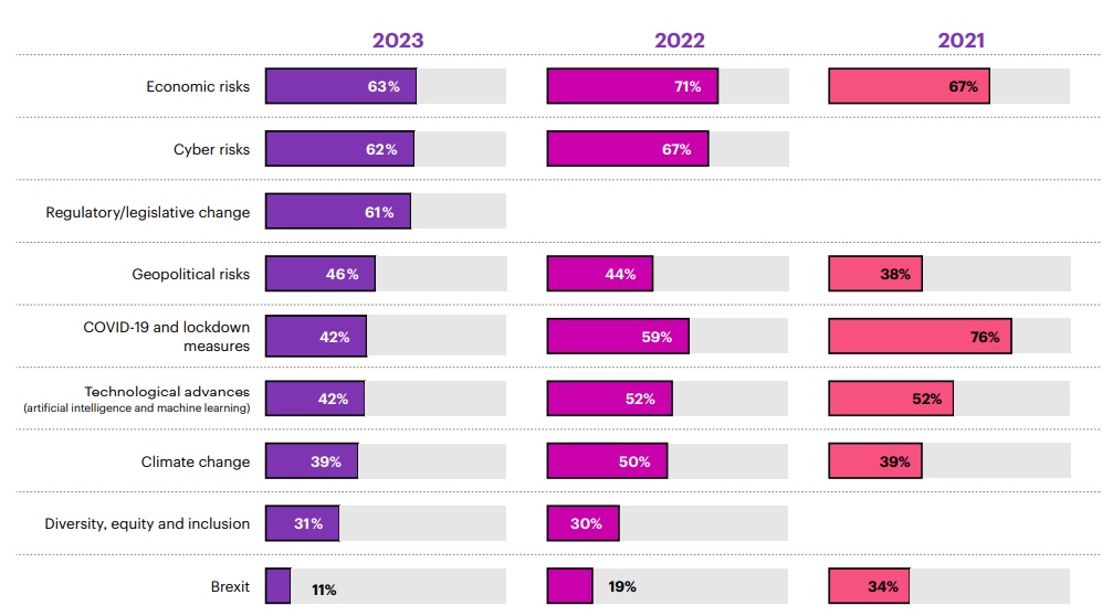Los riesgos económicos y cibernéticos ocupan las dos primeras posiciones y suponen la mayor preocupación para el 63% y el 62% de los encuestados, en particular la pérdida de datos y el ransomware preocupan cada vez más a los administradores y directivos .