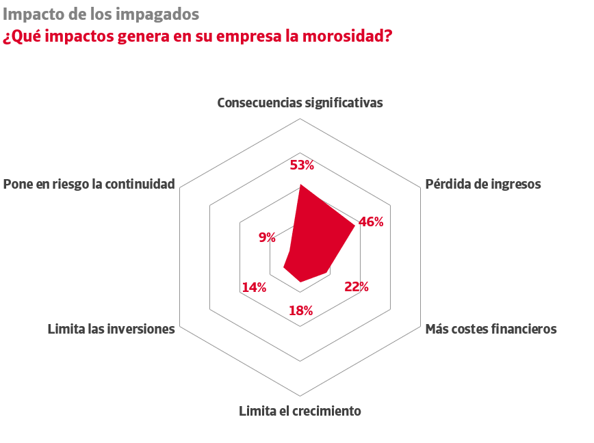 También se extrae que el 46% de las firmas españolas reconocen que afrontan pérdidas de ingresos significativas a causa de la morosidad. En un contexto de con tipos de interés aún elevados, el retraso en el pago de los clientes también provoca que el 22% del tejido empresarial registre un incremento de sus costes financieros. El 18% tiene que frenar su expansión comercial y el 14% se ve obligado a limitar sus nuevas inversiones.
