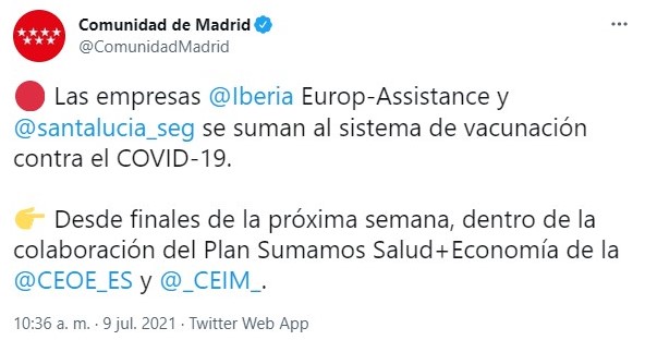La Comunidad de Madrid ha validado las instalaciones de Iberia, que además aportará personal de seguridad y administrativo, mientras que Europ Assistance pondrá a disposición de este centro su personal sanitario. Del mismo modo, ha dado vía libre para que el Grupo Santalucía comience a vacunar empleando sus propios recursos humanos y técnicos en las instalaciones de su Servicio Médico. Ambos centros empezarán a vacunar a sus trabajadores a partir del viernes 16 de julio y a la población en general el siguiente viernes, el 23 de julio.