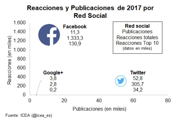 El informe 'Análisis Estratégico de Posicionamiento en redes sociales' de ICEA muestra también que en Twitter las publicaciones más influyentes son los retweets, mientras que en Facebook son los post donde se incluyen fotos, generando 4 veces más reacciones que en Twitter.