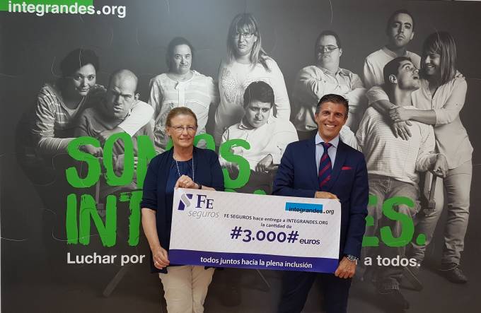 FE Seguros ha entregado un cheque por valor de 3.000 euros a Integrandes, asociación que trabaja día a día en la inclusión de personas con discapacidad intelectual y con la que la aseguradora realiza un calendario solidario. El acto de entrega se ha celebrado en Aranjuez (Madrid), donde la asociación lleva a cabo su actividad. Lo ha recibido Isabel González, presidenta de Integrandes, de manos de Ricardo Dapena, director general de Fe Seguros.