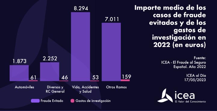 Por líneas de negocio, los ramos con mayor rendimiento en la investigación contra el fraude fueron los de Vida, Accidentes y Salud. En ellos se evitó un importe promedio de 8.294 euros por caso, con un coste de investigación de 53 euros. Esto supone un ahorro de 157 euros por euro invertido en investigación, apunta ICEA.
