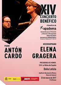 La Fundación Divina Pastora patrocina el concierto benéfico de la Asociación para la Promoción y Atención a las Personas con Discapacidad Intelectual (Apadema) que se celebrará el 23 de marzo, a las 19:30 horas, en la Sala de Cámara del Auditorio Nacional de Música y que cuenta con la presidencia de honor de Doña Leticia. La actuación correrá a cargo de la mezzosoprano Elena Gragera, acompañada al piano por Antón Cardó.