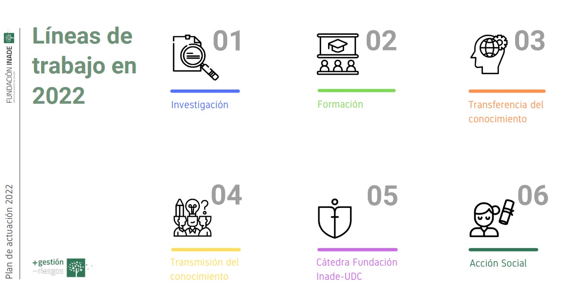 Estas líneas de trabajo se basan en la investigación, impulsando la puesta en marcha del Observatorio de Riesgos Empresariales de Galicia en colaboración con la Xunta de Galicia, la Universidade de Santiago de Compostela, y la Confederación de Empresarios de Galicia; formación, a través de la tribuna Aula Inade; transferencia del conocimiento; transmisión del conocimiento; la Cátedra Fundación Inade-UDC y acción social con la celebración del Día Mundial del Seguro y la entrega de los Premios Galicia Segura.