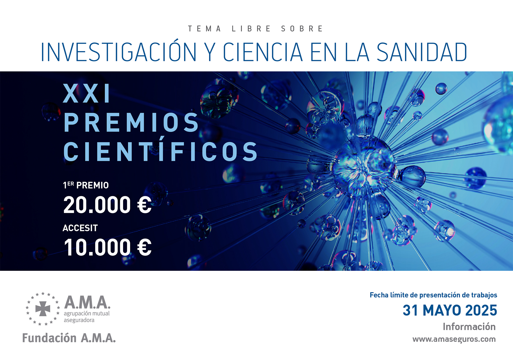 Fundación A.M.A. ha convocado sus XXI Premios Científicos. El patronato de la Fundación ha acordado que la temática sea libre, con la condición de que el trabajo de investigación esté relacionado con la salud. Si bien, deberá ser original y escrito en lengua castellana.