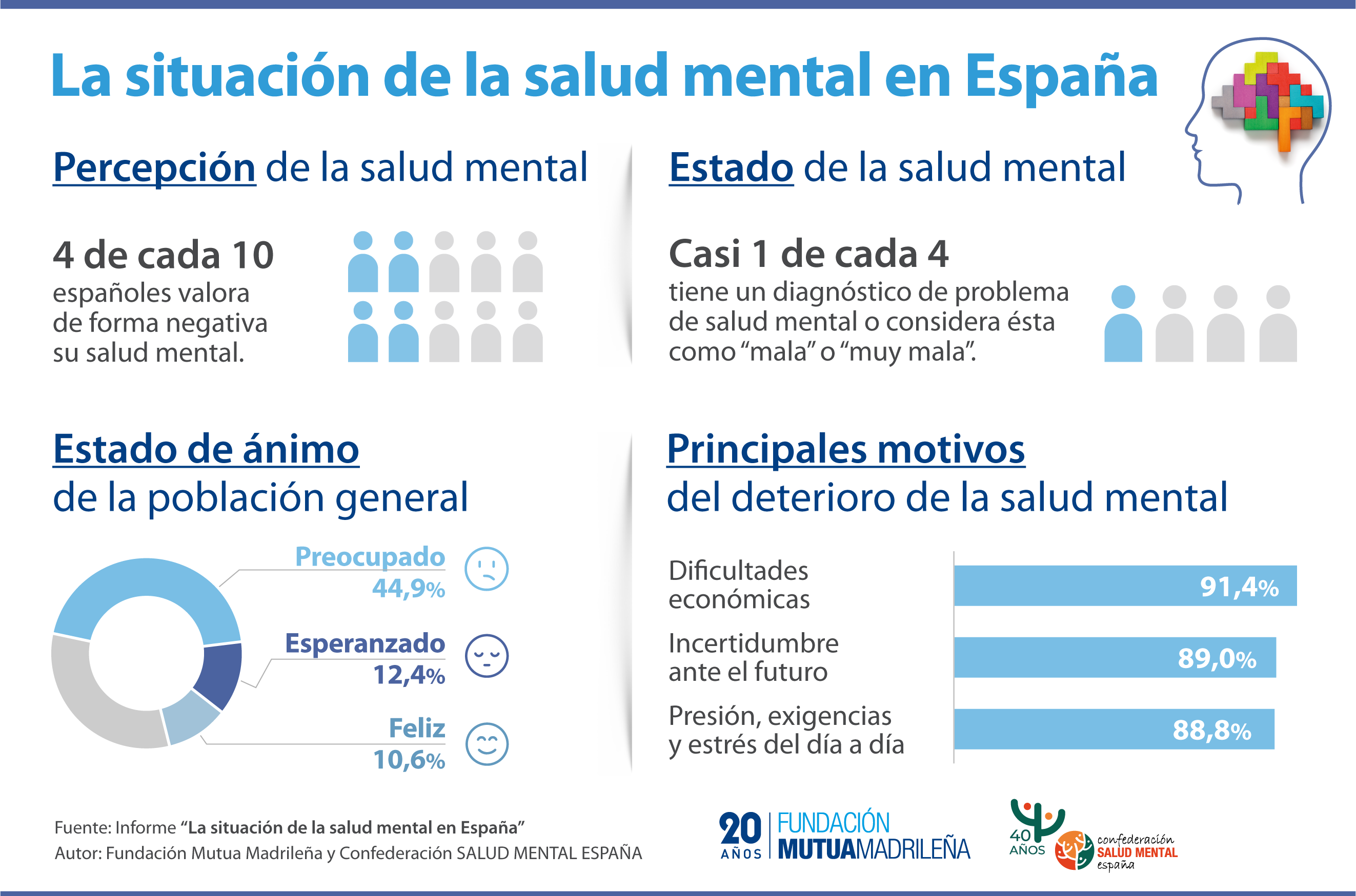 Casi 6 de cada 10 españoles se sienten preocupados, temerosos, deprimidos o tristes. Según revela el informe, el 42,1% ha sufrido depresión a lo largo de su vida; un 47,6%, ataques de ansiedad o pánico; y un 36,9%, ansiedad prolongada en el tiempo. Además, el 14,5% de la población ha tenido ideas suicidas o ha intentado suicidarse, ocurriendo en mayor medida entre las mujeres. Por edad, las ideas o el intento de suicidio (31,8%) y las autolesiones (30,7%) se producen en mayor grado en el grupo de jóvenes de 18 a 24 años.