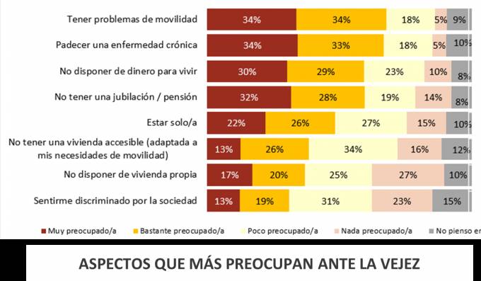 Otros resultados que deja el informe son que 1 de cada 3 españoles está muy o bastante preocupado por su vejez, aunque la mayoría (43%) se muestra poco o nada preocupada y un 11% ni siquiera piensa en ello. Es de destacar que los más jóvenes (18 a 24 años) y los más mayores (65 a 74 años) son los que muestran un grado de preocupación menor.