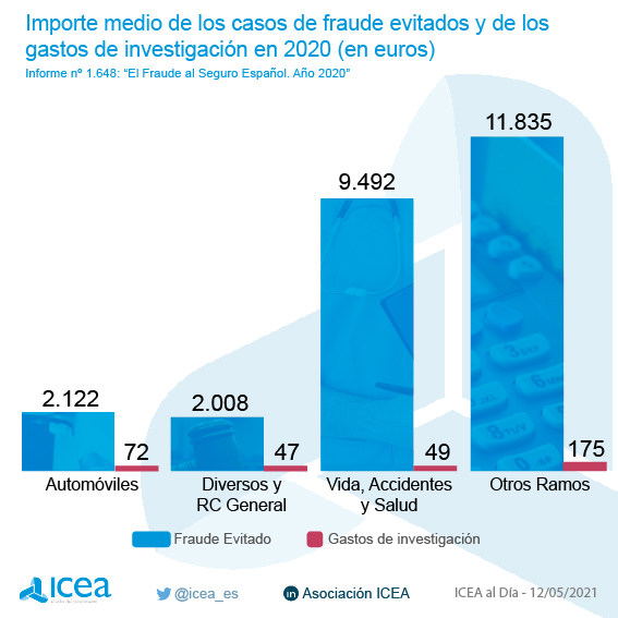 En 2020, según datos de ICEA, el importe medio de las reclamaciones fraudulentas evitadas por las aseguradoras españolas ascendió a 2.287 euros. Para su consecución, las compañías dedicaron a investigación unos gastos medios de 64 euros por caso, lo que quiere decir que se ahorraron casi 36 euros por euro invertido.
