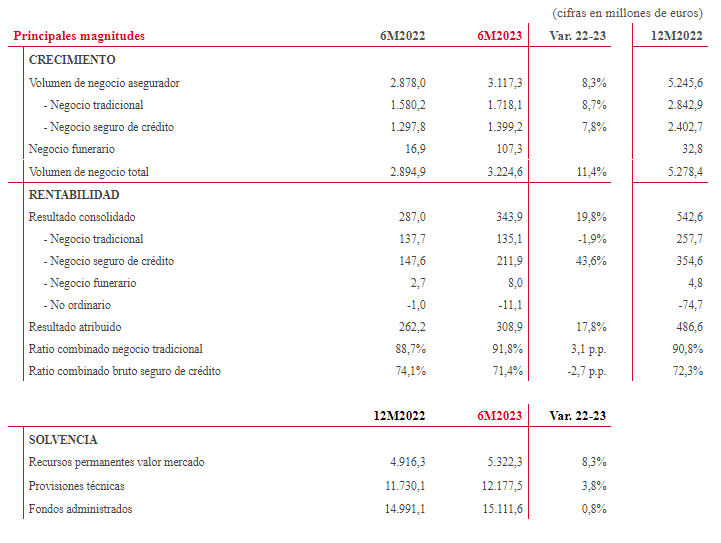 Asimismo, GCO ha obtenido un volumen de negocio que asciende hasta los 3.224,6 millones de euros, elevándose un 11,4%. Y crecen sus tres ramas de negocio. El negocio tradicional contribuye a la facturación con 1.718,1 millones de euros, un 8,7% más que un año atrás, destacando el crecimiento en Multirriesgos (+7%) y en Diversos (+7,9%). Mientras, el negocio del seguro de Crédito ha aumentado un 7,8% su volumen de negocio (primas facturadas más ingresos por información), alcanzando los 1.399,2 millones de euros. En cuanto al ratio combinado bruto de reaseguro, se ha situado en el 71,4%, 2,7 puntos por debajo al del primer semestre del ejercicio anterior. La entrada de siniestros sigue manteniéndose por debajo del nivel pre-pandemia y se mantiene la prudencia en el nivel de provisiones de años anteriores. Por su parte, el negocio funerario ha registrado un volumen de negocio de 107,3 millones de euros.