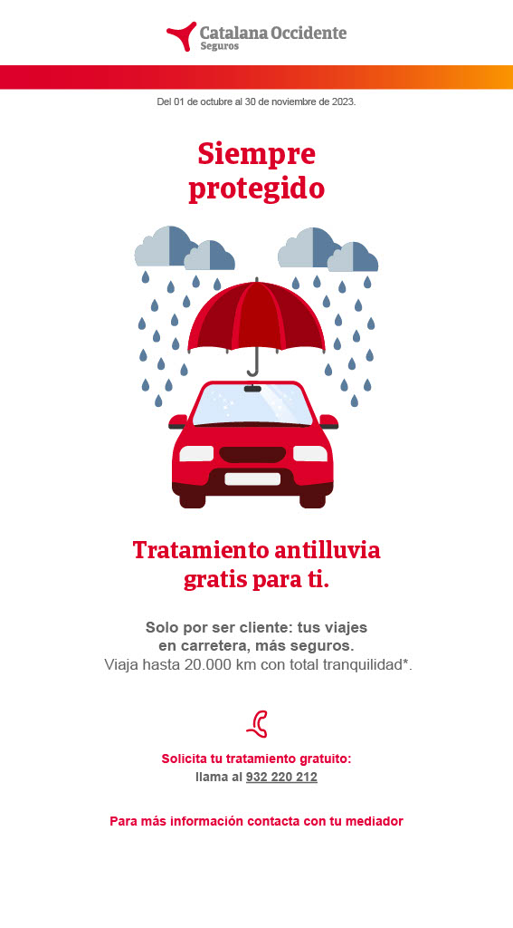 Seguros Catalana Occidente, Plus Ultra Seguros y Seguros Bilbao (Occident) ponen a disposición de sus clientes que cuenten con garantía de lunas un tratamiento antilluvia gratuito, promoción válida hasta el 30 de noviembre.