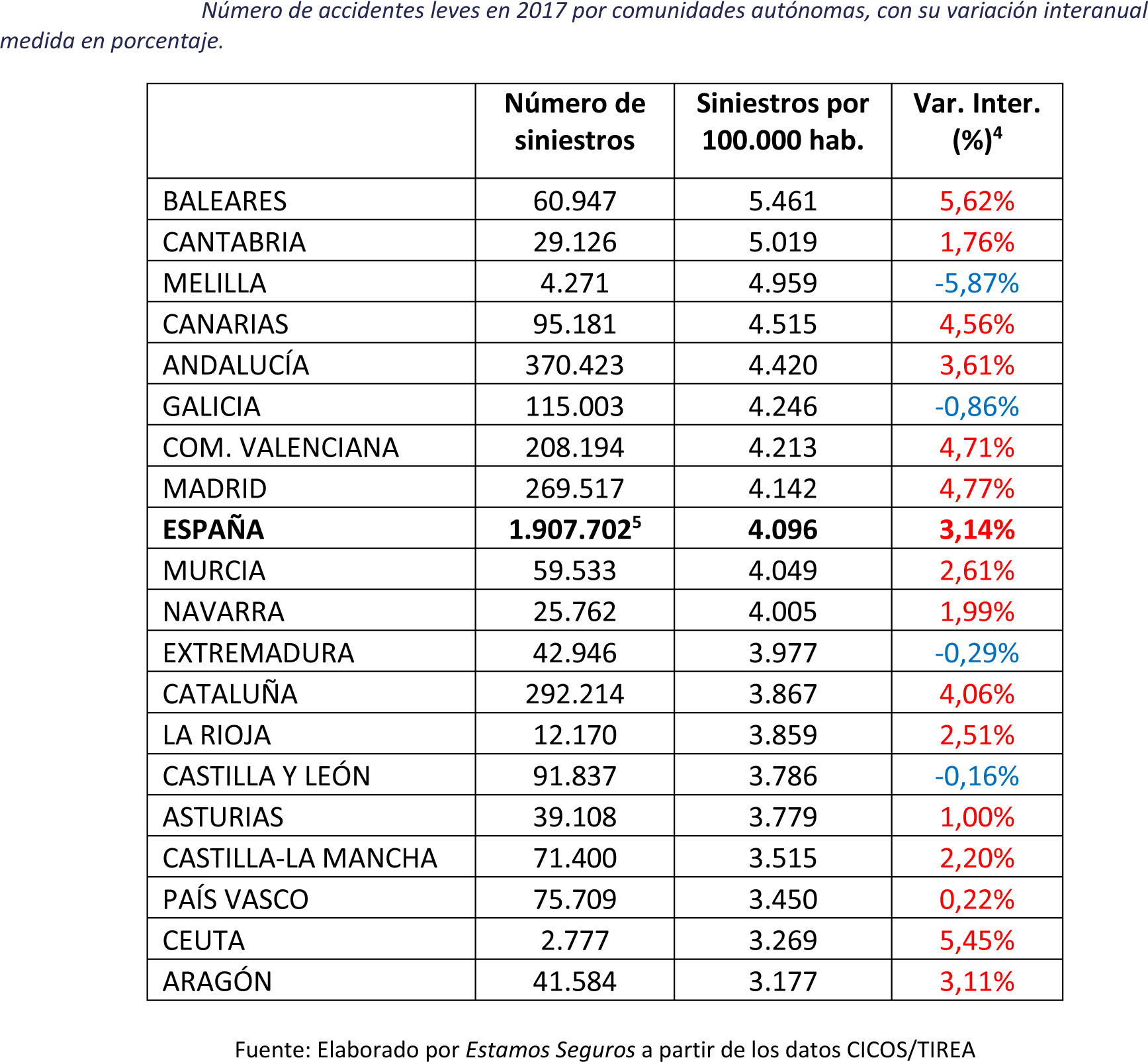 En 2017, se produjeron 1,91 millones de accidentes leves de tráfico en España. Esta cantidad supone un incremento interanual del 3,14%. Se trata del mayor número de incidentes de circulación sin heridos registrado desde 2010. Los datos han sido recabados por Tirea, la empresa informática encargada de gestionar la plataforma de liquidación de percances Cicos, y son divulgados por Estamos Seguros.
