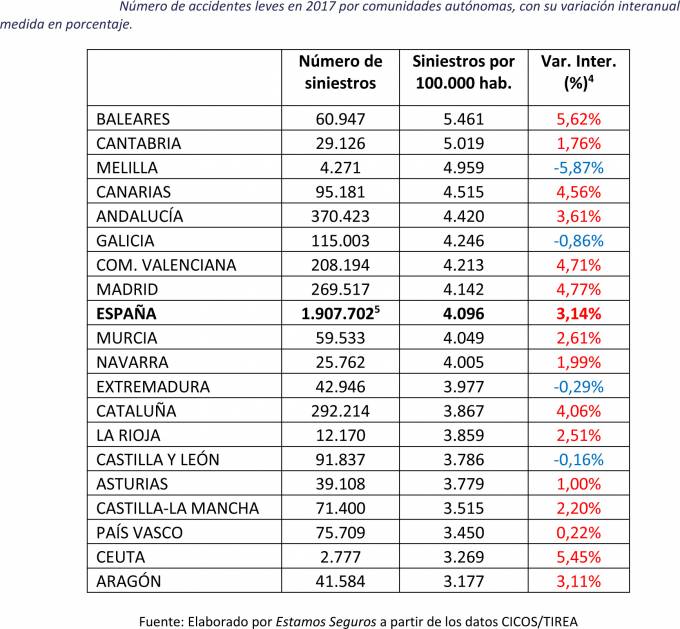 El panorama cambia si se analiza la cantidad de accidentes por cada 100.000 habitantes. Bajo este prisma, los lugares donde resulta más complicado conducir son Baleares (5.461 colisiones), Cantabria (5.019), Melilla (4.959) y Canarias (4.515). Los lugares donde la siniestralidad en relación al tamaño de su población es más baja son Aragón (3.177), Ceuta (3.269), País Vasco (3.450) y Castilla-La Mancha (3.515).