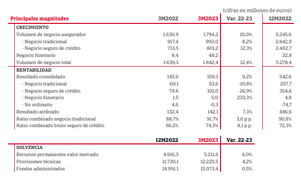Por su parte, el negocio de seguro de Crédito, realizado a través de Atradius Crédito y Caución y Atradius Re, registró 101 millones de beneficio, con una subida del 27% "manteniendo su tendencia positiva". Las primas y los ingresos por información también creció un 12,3% y totaliza 801,2 millones. El ratio combinado bruto en esta línea de negocio marca el 74,3%, 8,1 puntos porcentuales más que en marzo de 2022 por la normalización de la siniestralidad.