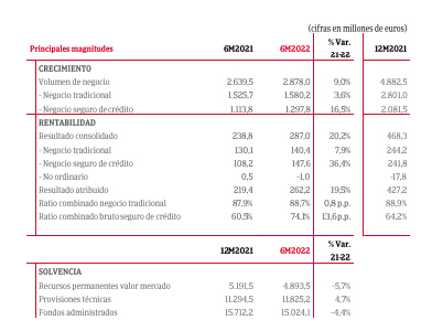 Otras magnitudes del grupo señalan que su ratio combinado del negocio tradicional alcanza el 88,7% (+0,88 pp más que el primer semestre del año anterior), mientras que este ratio del seguro de Crédito mejoró 13,6 pp hasta el 74,1%. Indica la entidad que la siniestralidad se sigue situando por debajo del periodo prepandemia.