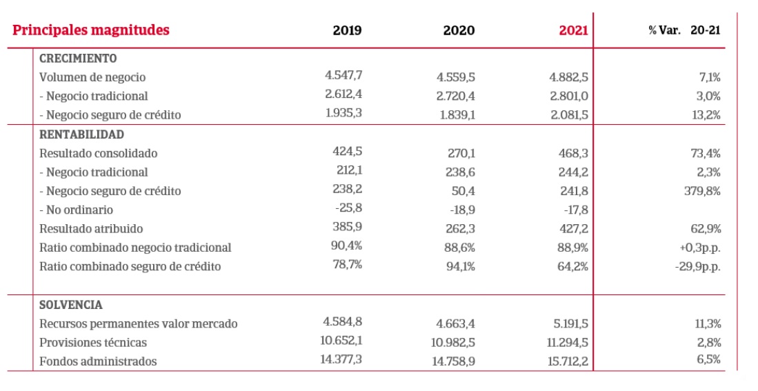 El seguro de Crédito (Atradius Crédito y Caución, y Atradius Re) suponen casi el 50% del beneficio del Grupo con un incremento del 379% respecto a 2020 hasta los 241,8 millones de euros, recuperando la actividad y resultados previos a la crisis sanitaria del Covid-19. Asimismo, el volumen de negocio del seguro de Crédito (primas facturadas más ingresos por información) alcanza los 2.081,5 millones de euros, un 13,2% más.