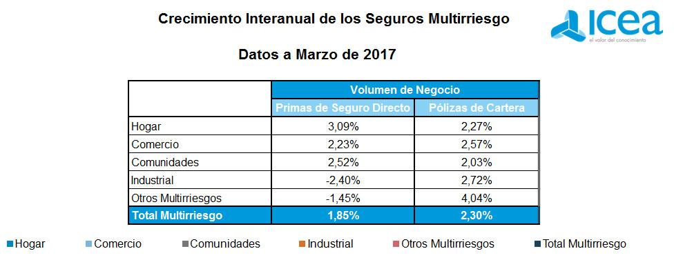 El volumen de negocio de Multirriesgo alcanza hasta marzo de 2017 un crecimiento en pólizas del 2,3% y un 1,8% en el volumen de primas. Según los datos de ICEA por modalidades de negocio el mejor resultado en pólizas lo ofrece Industrial