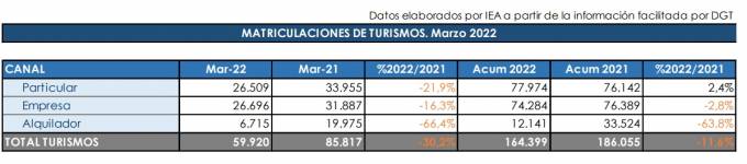 Por canales, el canal de particulares registra una fuerte caída de sus entregas del 22%, hasta las 26.509 unidades. El canal de alquiladores, por su parte, recorta sus entregas en un 66,4%, hasta las 6.715 unidades. La caída de los alquiladores es especialmente reseñable por la proximidad de la Semana Santa, momento en el que renuevan sus flotas.