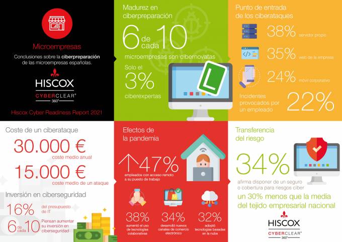 El coste medio de los incidentes ciber que afectan a las microempresas –con menos de 9 empleados- alcanza casi los 30.000 euros, según datos del 'Barómetro de Ciberpreparación de la Microempresa 2021' realizado por Hiscox. El coste medio del ataque que ocasionó más costes está en torno a los 15.000 euros. "Las microempresas españolas asumen un coste menor que la media de nuestro tejido empresarial, pero si contextualizamos esta cifra en los presupuestos que manejan el impacto en el negocio es mucho mayor que en pymes o grandes empresas", apunta Nerea de la Fuente, directora de suscripción técnica de Hiscox.
