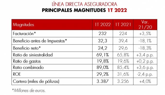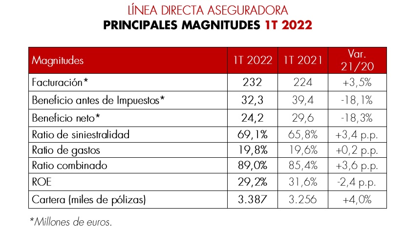 El beneficio neto de Línea Directa ha caído un 18,1% en el primer trimestre del año, aunque los ingresos por primas de la compañía aumentaron en el primer trimestre de 2022 un 3,5%, hasta los 232 millones de euros. Según informan en un comunicado, el Grupo logró un incremento de la facturación por pólizas en todos los ramos en que opera fruto de la captación de nuevos clientes y de la fidelización. Motor recuperó el crecimiento en primas (+1,7%), y los ingresos tanto de Hogar (+11%) como de Salud (+14,6%) han crecido a doble dígito.