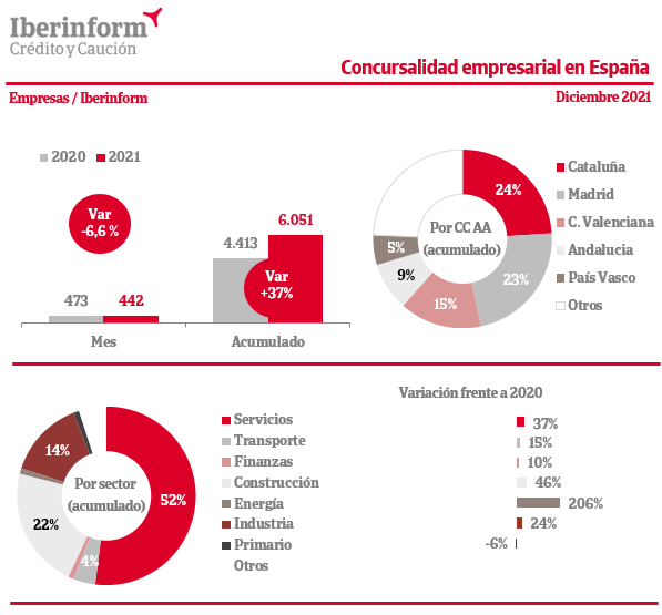 La concursalidad creció un 37% en 2021, según constata Iberinform tras analizar los procesos concursales publicados en el BOE a lo largo del pasado ejercicio. Y ello a pesar de la moratoria decretada por el Gobierno que exime a las empresas en situación de insolvencia de declararse en concurso de acreedores. En España, esta medida se ha prorrogado hasta el 30 de junio de 2022.