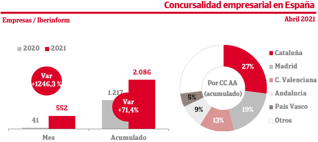 En el primer cuatrimestre de 2021, la economía española registró un incremento del 71,4% de las insolvencias empresariales, de acuerdo con los datos facilitados por Iberinform tras analizar los procesos concursales publicados en el BOE. Los niveles aumentan a pesar de que el Gobierno acaba de aprobar una nueva prórroga de la moratoria concursal hasta el próximo mes de diciembre.