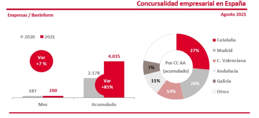 En el caso de España, aunque la actual moratoria finalizará el 31 de diciembre de 2021, los datos reflejan ya un incremento de los niveles de concursalidad. En concreto en agosto de 2021 se han presentado un 7% más que en el mismo mes de 2020.