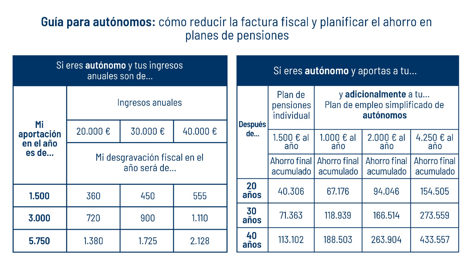 Respecto a los PPES, Inverco especifica a los autónomos que pueden realizar aportaciones adicionales a Planes hasta alcanzar un límite total de 5.750 euros anuales, para deducirse en IRPF el total de aportaciones hasta la menor de las cantidades entre el 30% de sus rendimientos netos de trabajo y actividades económicas, o esos 5.750 euros. Asimismo, indica que un autónomo que realice una aportación de 1.500 euros antes de final de año, y tenga unos ingresos de 20.000 euros anuales, podrá reducir su factura fiscal por aportación a Planes en 360 euros. Y si ese mismo autónomo aportase el importe máximo desgravable (5.750 euros), la desgravación alcanzaría 1.380 euros. Además, matizan en Inverco que si los ingresos anuales del autónomo fueran 40.000 euros anuales, la desgravación correspondiente a una aportación de 1.500 euros sería de 555 euros y con el máximo de aportación (5.750 euros), ese ahorro fiscal se incrementaría hasta los 2.128 euros.