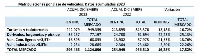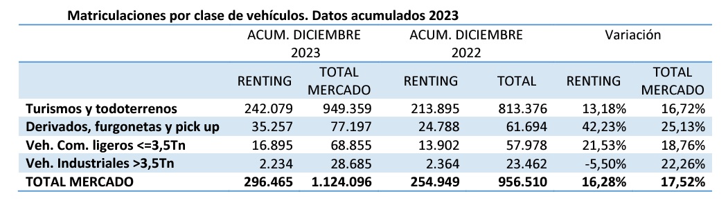 En cuanto a las matriculaciones de vehículos registradas por las compañías de renting, al cierre de 2023, han aumentado un 16,28% respecto a 2022 hasta las 296.465 unidades y suponen un 26,37% del peso total del mercado, que cerró el año con 1.124.096 unidades matriculadas.