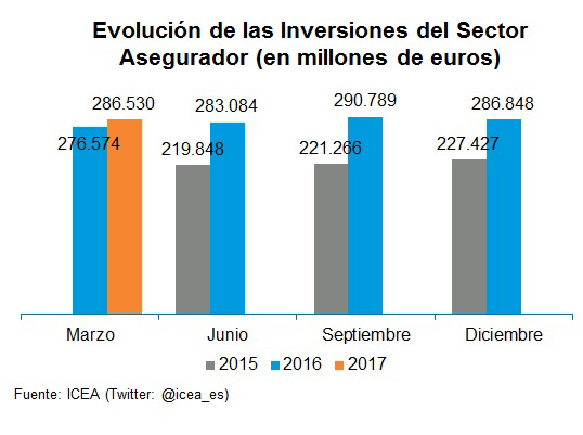 El volumen estimado del total de las inversiones del sector asegurador español en el primer trimestre de 2017 alcanzó los 286.530 millones de euros. El 56,5% de dicho volumen representa la inversión de la cartera de Vida, el 12,9% la correspondiente a No Vida, un 4% a los fondos propios, los fondos de disponibilidad limitada suponen el 0,2%, otros fondos internos un 0,2% y el 26,2% restante a la cartera general, según los datos de ICEA.