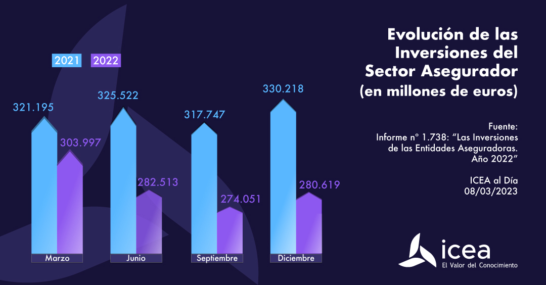 Al cierre del cuarto trimestre de 2022, el volumen estimado del total de las inversiones del sector asegurador se situó en 280.619 millones de euros, mostrando un repunte en comparación con los 274.051 millones de euros al término del tercer trimestre. Los datos pertenecen al informe 'Las inversiones de las entidades aseguradoras. Estadística a diciembre 2022' publicado por ICEA.