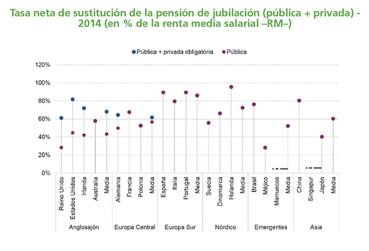 En Europa del Sur con modelos basados en pensiones públicas, la tasa se sitúa actualmente en el 80%, pero con un alto riesgo de sostenibilidad. En España estamos en el 80% pero se bajará al 50% en el sistema público. “Pero si somos astutos y empezamos a ahorrar no más, pero sí mejor podemos mantener tasas altas”. “En España hay ahorro suficiente”, dijo.