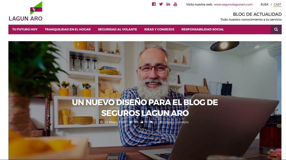 El nuevo blog se estructura en las siguientes secciones: 'Tu futuro hoy', donde se publicarán post relativos a tendencias, tecnología, insurtech y a los seguros de Vida, Salud, Ahorro o Accidentes; 'Tranquilidad en el Hogar', con toda la información relacionada con la vivienda, el seguro, la prevención de accidentes y la seguridad; 'Seguridad al volante', donde se incluirán textos sobre automóviles, prevención en carretera, seguridad vial y novedades de la DGT; 'Ideas y consejos', donde se alojarán noticias de diferentes temáticas como la alimentación, el deporte, la salud, el comercio, el negocio, vacaciones y viajes; 'Responsabilidad Social', sección que incorporará información sobre Responsabilidad Social Empresarial tanto de Lagun Aro como de otras redes europeas.