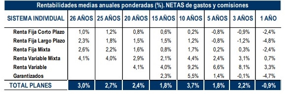 En cuanto a las rentabilidades, el largo plazo sigue registrando una rentabilidad media anual (neta de gastos) del 3%; en el medio plazo (10 y 15 años), del 3,7% y 1,8%, respectivamente; y a un año, del 0,9%. En los demás periodos, se han registrado rentabilidades positivas.