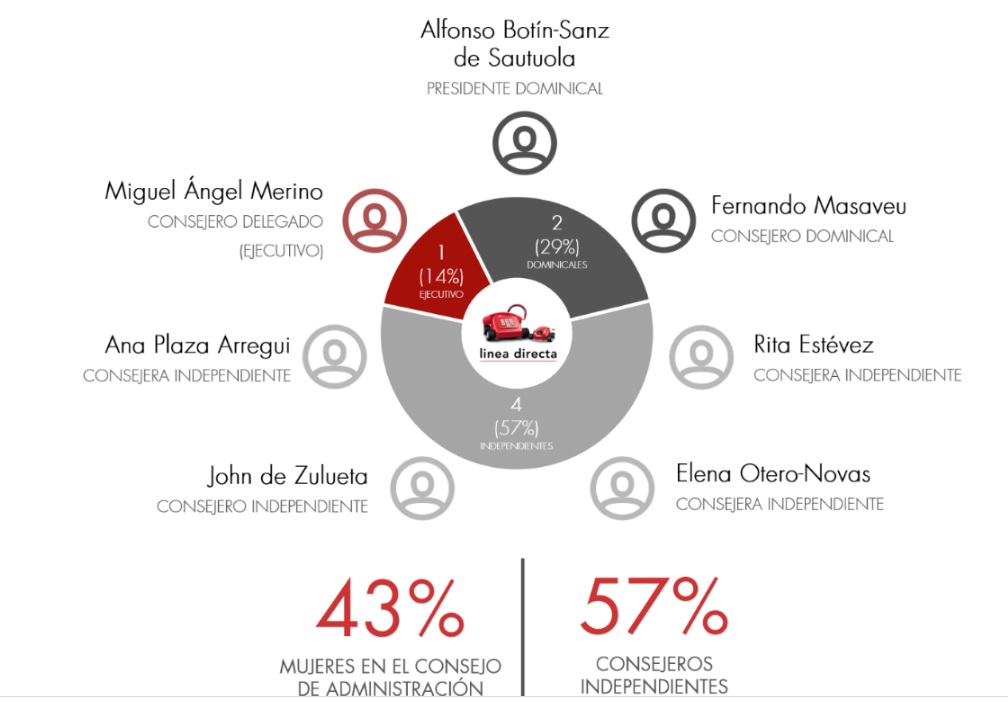 El nuevo órgano de administración de la compañía estará formado por Miguel Ángel Merino, consejero delegado de Línea Directa Aseguradora, en su condición de único consejero ejecutivo; dos consejeros dominicales (Alfonso Botín-Sanz de Sautuola y Naveda, que será además presidente del Consejo, y Fernando Masaveu) y cuatro independientes (Elena Otero-Novas, Rita Estévez, Ana María Plaza Arregui y John de Zulueta). De esta forma, el consejo de administración de Línea Directa Aseguradora se reducirá de 9 a 7 miembros.